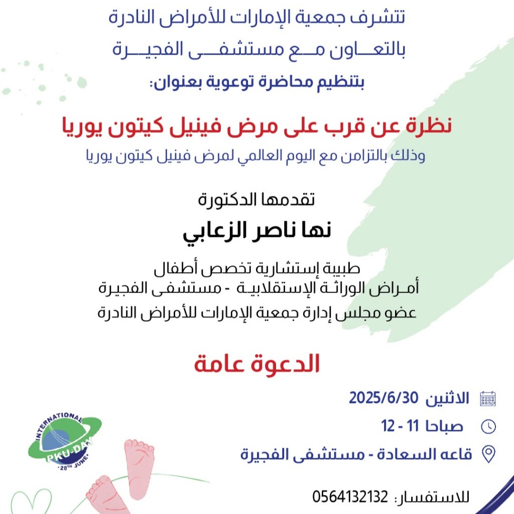 يسر جمعية الإمارات للأمراض النادرة بالتعاون مع مستشفى الفجيرة دعوتكم لحضور محاضرة تثقيفية بعنوان: “نظرة عن قرب لمرض فينيل كيتون يوريا (PKU)” وذلك تزامناً مع اليوم العالمي للتوعية بمرض PKU.